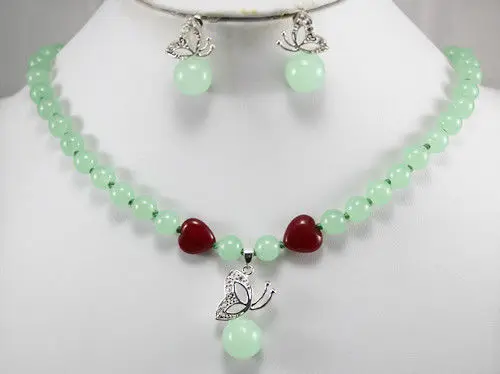 Beautiful jewelry green gem necklace butterfly pendant earrings set Quartz Fine Bridal wide watch w
